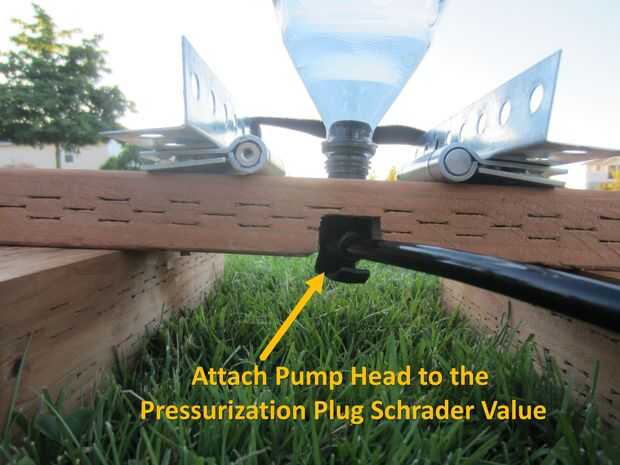 Lanzamiento de comenzar presurizar la botella de 2 litros por bombeo de la bomba de bicicleta.  Cerca de 10 bombas buena da un buen resultado; sin embargo, el experimento con el número de bombas para determinar lo que funciona bien para usted.