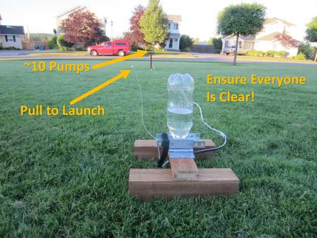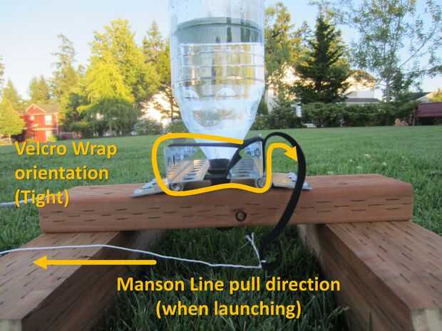 Cuando esté listo para el lanzamiento, tire de la #18 Twisted Mason línea "descomprimir" la correa de Velcro. Esto hará que el Velcro tirar lejos permitiendo la abrazadera de la plataforma de lanzamiento retraer; una vez que las abrazaderas de la plataforma de lanzamiento de retracción, la botella de 2 litros debe tener suficiente presión para expulsar el tapón de presión. Con el tapón de presión extrae, la botella de 2 litros se empuje hacia abajo haciendo que la botella de Levante de 2 litros de agua a presión.