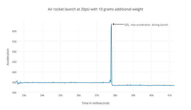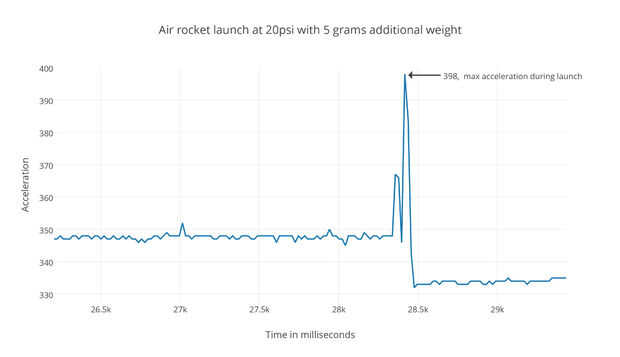 En nuestro primer lanzamiento el eje del acelerómetro máximo X el valor registrado es 664. Con un adicional 5 gramos el valor máximo es de 398 y con 10 gramos añadidos el valor máximo es 635. Si convertimos estos números en valores de g (675 = + 16 g) nos 9.43 g para el segundo lanzamiento, get + 15.73 g para el primer lanzamiento y + 15,05 g para el tercer lanzamiento.
