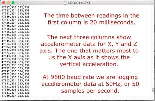 Al leer los datos desde la tarjeta SD a ver hay cuatro columnas de números. La primera columna es el tiempo transcurrido en milisegundos. La siguiente columna es la el eje del acelerómetro X lectura, seguido por el eje Y y Z. Con el propósito de este experimento, lo realmente importa es los datos del eje X como muestra la aceleración vertical del cohete.