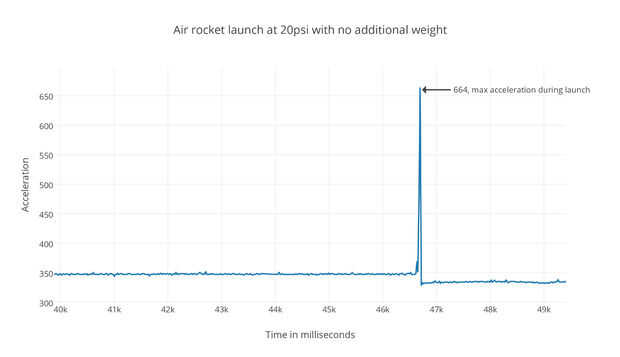Esta ley se expresa en la fórmula F = ma. F = fuerza (en nuestro caso la presión de aire de 20 psi de nuestro launcher), m = masa (la masa de nuestro cohete) y a = aceleración (la aceleración registrada de nuestro cohete).