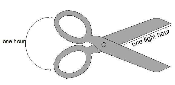 Qué pasa si usted tiene un enorme par de tijeras con las cuchillas 1 hora luz larga (1,079,252,848,800 metros) y picado juntos de tal manera que los dos extremos se reúnen en una hora. ¿El lugar donde se cruza con las dos cuchillas se movería a la velocidad de la luz, derecha?