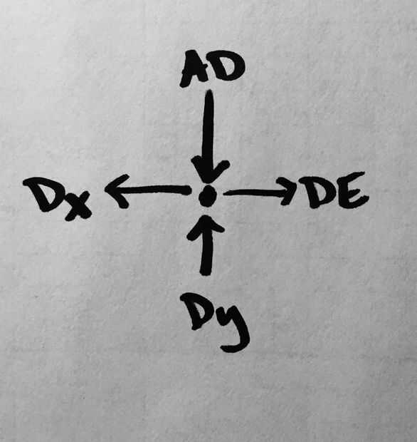 La misma idea se aplica a DE. DX es apuntado a la izquierda, por lo que debe haber una fuerza para el derecho a oponerse.