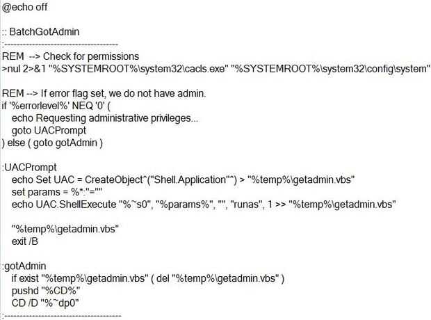 eco sistema UAC = CreateObject^("Shell.Application"^) > "% temp%\getadmin.vbs"