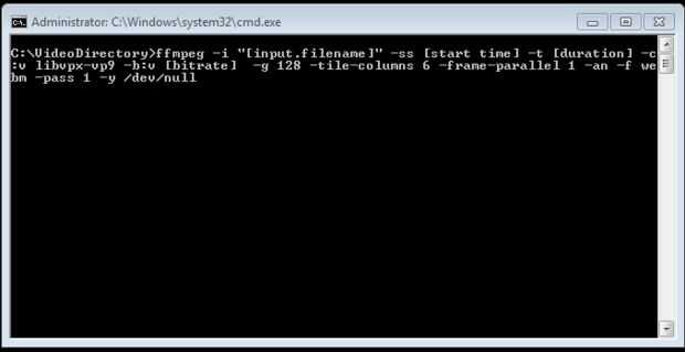 ffmpeg -i "[input.filename]"-ss [hora Inicio], t [duración] - c: v libvpx vp9 - b: 128 – azulejo de v [bitrate] – g-columnas 6 – marco-1 – una – f webm en paralelo – paso 1 – y/dev/null