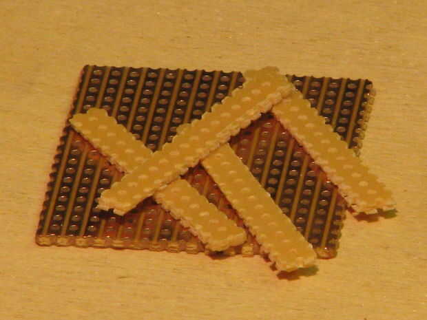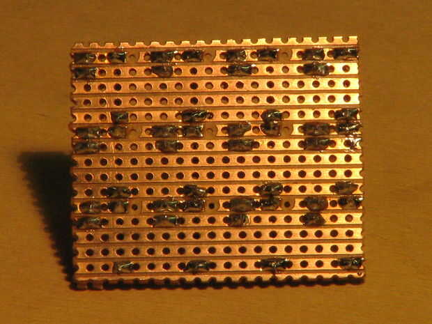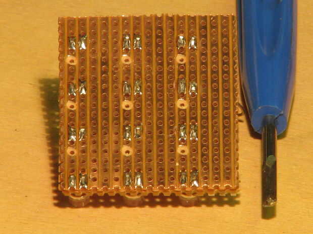Cortar 4 tiras de veroboard llano solo agujero. Éstos deben actuar como espaciadores para dar espacio para las resistencias cuando el conjunto se monta en la tapa de la lata. Puse puntos de tinta en cada uno para que no se mezclan.