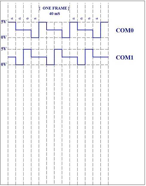 En t1 COM0 es Vcc, t2 y t3 son Vcc/2 y en t4 COM0 es que GND. COM1 es idéntico a COM0 pero 180 grados fuera de fase con COM0; T1 es Vcc/2, t2 Gnd, Vcc de t3 y t4 tierra. Con más de 2 planos tendrá más divisiones en cada fotograma (período) de nuevo. Este marco es de 40 mS amplia o 25Hz. La documentación dice que es demasiado lento pero funciona OK. Cualquier problema sólo acorta todos los tiempos para aumentar la frecuencia, es una cuestión de miradas; con la frecuencia muy baja te darás cuenta el parpadeo, causas demasiados fantasma.