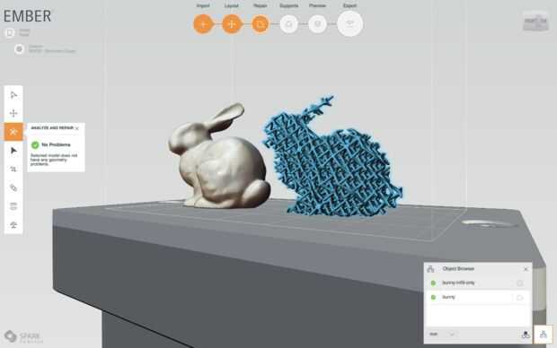 El equipo de chispa han desarrollado una herramienta que permite crear estructuras de modelos sólidos. Por ejemplo, si tomamos el conejito de Stanford omnipresente podemos crear una representación de enrejado y luego usar Print Studio para cortar para brasa, pero es difícil controlar el producto final utilizando esta técnica. Por ejemplo, si descarga los modelos de conejito a ver que algunas partes del enrejado en los oídos no están conectadas al cuerpo principal. Para diseñar con éxito para DLP de alta velocidad, usted necesita software de diseño que entiende el proceso, el hardware y los materiales.