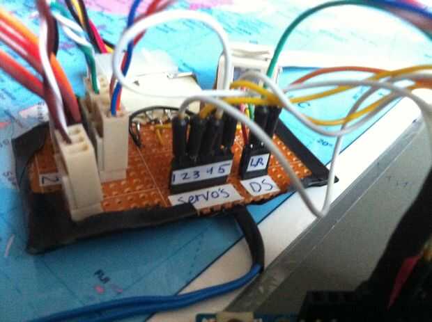 He utilizado 5 servo connector´s para 6 servo´s, beceaus la 2 servo´s en el bottem está usando la misma señal. debe soldar los cables al comprador y conectar a la placa de potencia