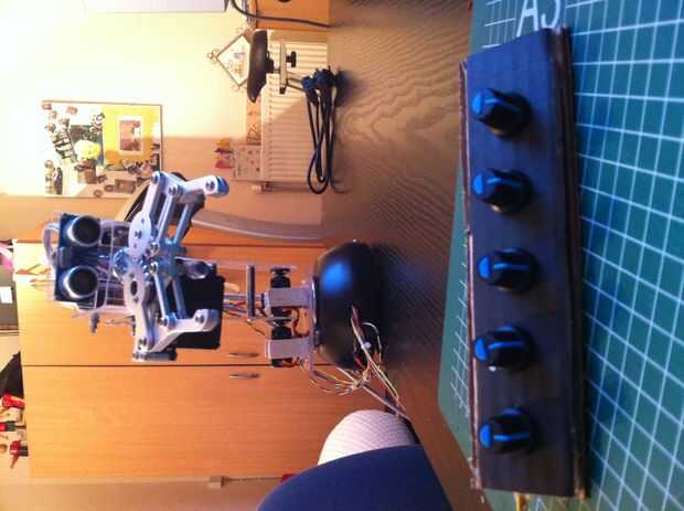 como se puede ver en el scematic, anuncio un potenciómetro para controlar el servo. el fino sólo tienes que hacer es repetir este ápice 5 señales voor el 6 servo´s. el pote no es nessersery sino el código won´t si no anuncio el Potentiometer´s.