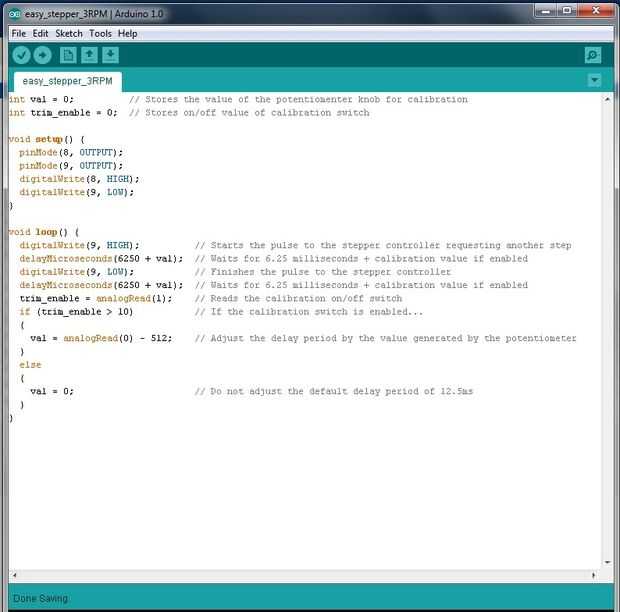 También decidió aplicar una perilla de calibración para hacer ajustes de un ajuste fino a la velocidad de rotación, en caso de que esto era necesario. El código para el Arduino es muy sencillo: