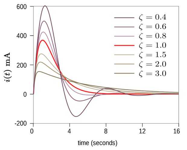 Estas oscilaciones pueden exhibir tres tipos de formas: sobreamortiguado críticamente amortiguado y rebote (segunda imagen). En la condición overdamped (alto factor de amortiguamiento, ζ), la corriente decae sin cruzar cero, mientras que en el rebote condición (baja factor de amortiguamiento), cruza cero muchas veces y oscila antes de decaer. Esta última condición es la que pretendemos en nuestra bobina.