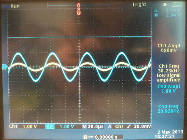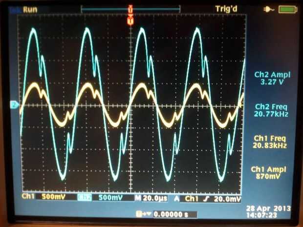 "Recorte" se produce si la potencia es muy alta; ver la última foto con las formas de onda funky. Si usted consigue una salida como esta, disminuye la potencia hasta que tenga una salida más suave. Para nosotros, el 55% de volumen completo (680 mV en) de la entrada nos dio una salida limpia de 1.88 V en 20780 Hz, una amplificación de 2.8 x.