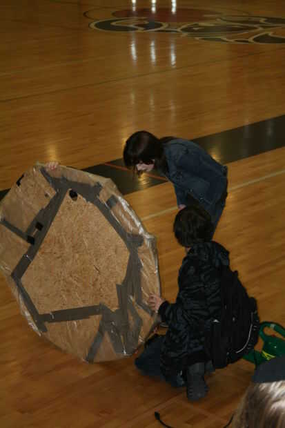 11. una vez que la tapa es segura a la plataforma con la lona en el medio vas a crear un total de seis agujeros en la lona en la parte inferior (lado que usted está viendo actualmente). Los orificios deben ser de 5 pulgadas desde el borde exterior de la tapa y deben ser espaciados uniformemente entre sí. ¿Los agujeros deben tener un diámetro de 2? pulgadas o menos.