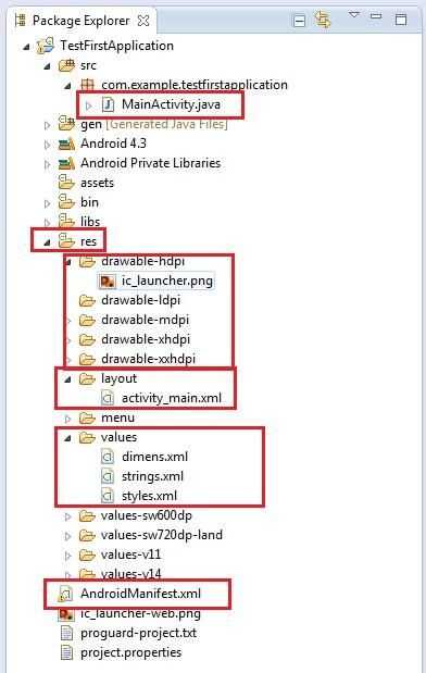 Cada proyecto de aplicación para Android cuenta con ciertos componentes específicos y necesarios que pueden verse en el espacio de trabajo del proyecto. La jerarquía de espacio de trabajo de todo el proyecto puede verse en el panel de "Paquete explorador" en la izquierda del editor. Panel del explorador de paquete en nuestro proyecto puede verse como se muestra en la imagen de arriba.