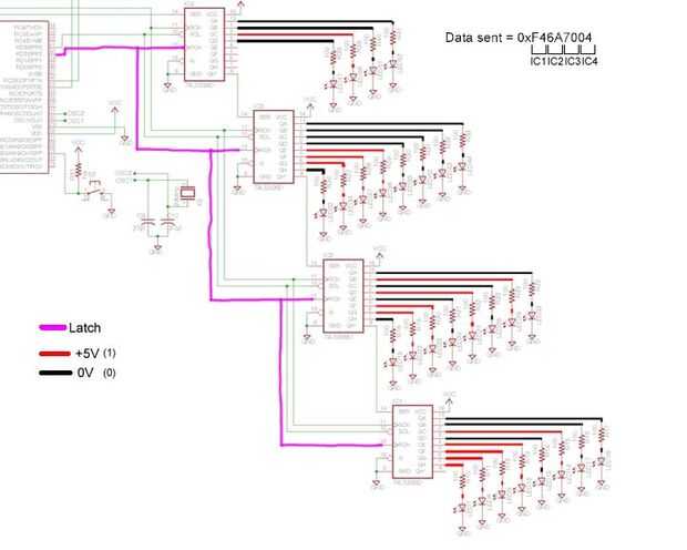 La cuarta etapa del circuito es de 4 x 74HC595. Una vez que el MCU ha leer el nivel de sonido, luego imaginará que LEDs se quiere encender y que LEDs quiere apagar (se almacena en 4 bytes de datos), entonces en serie se transmiten los 4 bytes de datos (un byte a cada 74HC595) y lo cierre. Una vez que se ha trabado el 74HC595, individuo LEDs se o bien activar o desactivar.