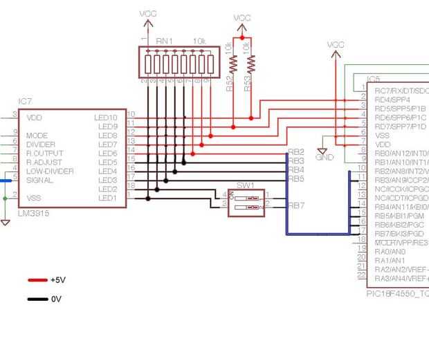 La segunda etapa del circuito es el LM3915 sí mismo. No necesitamos saber realmente cómo funciona el LM3915, solo tenemos que saber cómo usarlo. Si su curiosidad, en la página 7 de la hoja de datos del LM3915 muestra una versión simplista del diagrama de cableado interno. Así, ahora tenemos una señal válida en la IC, pero ¿cómo sabe qué nivel de sonido el LM3915 está en MCU (unidad de microcontrolador)? Pues si nos fijamos en el esquema se dará cuenta de que cada una de las salidas de LM3915s (LED1 - LED10) son alimentados en una entrada con el PIC18F4550. Cada salida se ata también alto por un resistor del 10 k (utilicé una red de resistencia) porque las salidas de LM3915s son un tipo de colector abierto. Significado, el LM3915 puede forzar las salidas en estado bajo (0v), pero no puede obligarlos a un estado alto (+ v). Para que cuando una salida no es ser baja, la resistencia es manteniéndolo en alto. Si todas las salidas están en un estado alto, el LM3915 no detecta ningún sonido. Si alguna o todas las salidas son bajas, el PIC18F4550 puede entonces interpretar el nivel de intensidad del sonido.