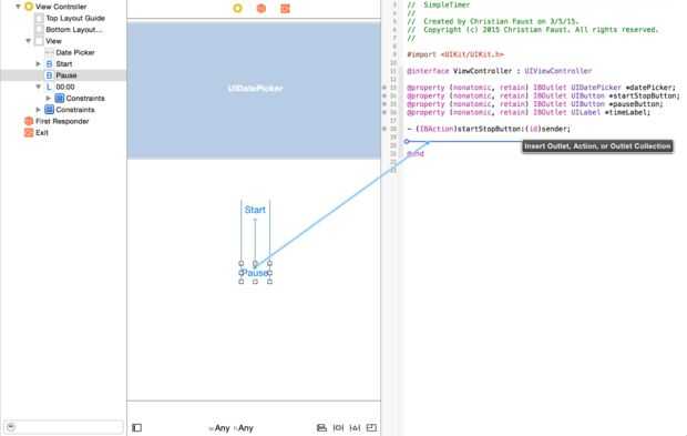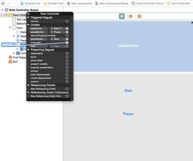 C. 4 haga clic en y arrastre el círculo al lado de 'datePicker' donde dice 'UIDatePicker'. Hacer lo mismo para los objetos startStopButton y pauseButton correspondiente.