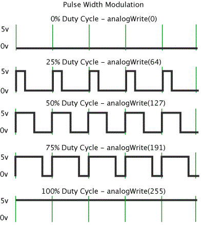 Control digital se utiliza para crear una onda cuadrada, una señal que conmuta entre encendido y apagado. Este patrón de encendido y apagado puede simular tensiones entre completa (5 voltios) y apagado (0 voltios) cambiando la parte del tiempo que la señal pasa en versus el tiempo que pasa la señal de apagado. La duración de "on time" se llama el ancho de pulso. Para conseguir diferentes valores analógicos, cambiar o modular, ancho de pulso. Si usted repite este patrón de cierre lo suficientemente rápido como con un LED por ejemplo, el resultado es como si la señal es una tensión constante entre 0 y 5v control de la luminosidad del LED.