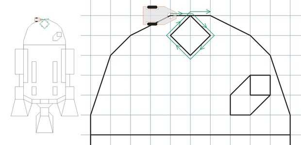 En este punto cabe señalar que cada cuadrado de la cuadrícula es un paso amplio y un paso alto. Así que si Bot Doodle fue trazar las líneas de 45° con exactitud realmente tendría que recorrer una distancia de aproximadamente 1,4 pasos (la hipotenusa de un triángulo donde cada uno de los otros lados = 1). El robot no puede viajar 1,4 pasos, el diamante en forma de ojo en la parte superior de la cabeza del robot será un poco más pequeño que se muestra en el mapa.