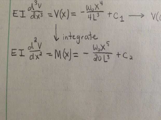 En este paso será integrar la ecuación final para la fuerza de esquileo, V(x), para obtener una ecuación para el momento flector interno, M(x). Esto se ilustra en la primera foto. Como el paso anterior, usted terminará con una desconocida constante de integración c2. Implementará la condición de frontera M (0) = 0 para resolver para c2.