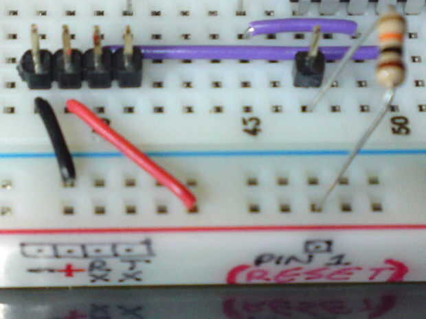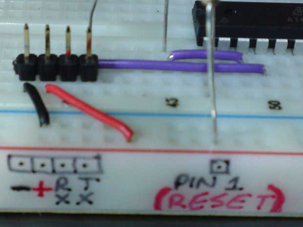 La imagen de abajo muestra el PIN de RESET en el Breduino junto con el-, +, RX y TX a la izquierda en la protoboard!