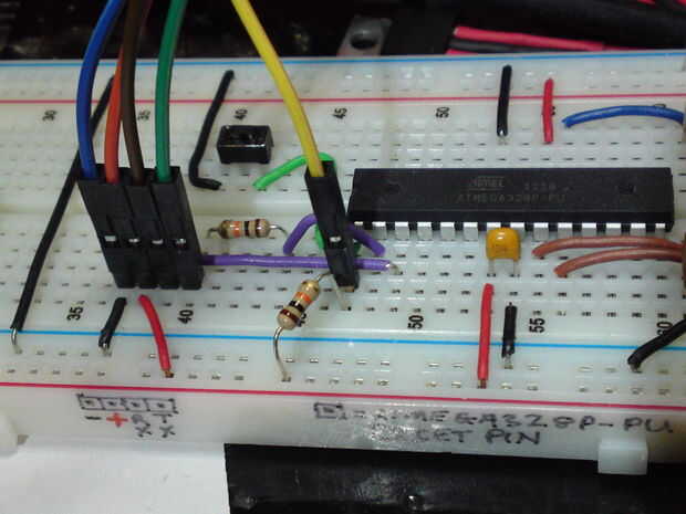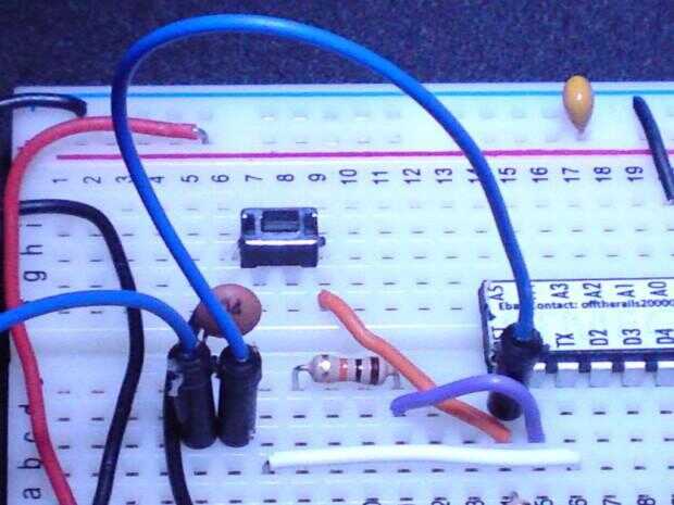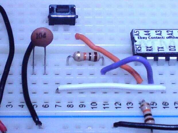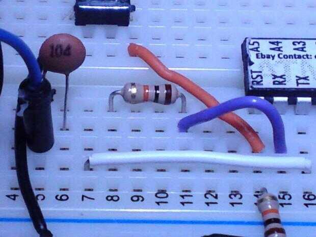 Y ahora la 2 º etapa de la 0.1uF condensador al pin de RESET del microcontrolador como se muestra en la foto abajo (cable azul de la otra, jajaja!):