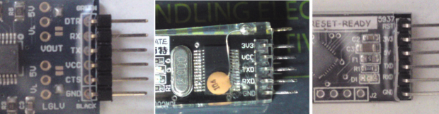 Ahora vamos a subir el sketch de 'Blink' a la Breduino tres diferentes módulos USB (estos son los únicos que tengo!) y mostrar cómo conectar estas hasta el Breduino y los pernos necesarios para subir bocetos: