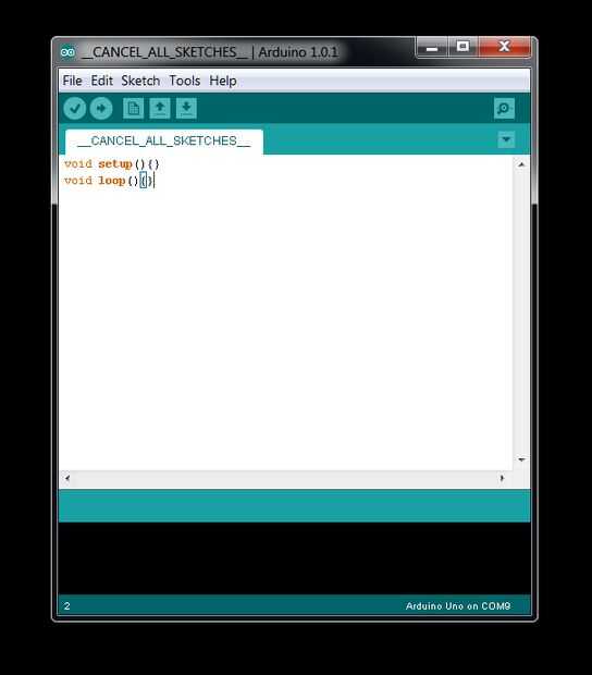 Guarde este bosquejo (archivo > guardar o archivo > Guardar como) y también tienes lo que me llevó horas y horas de Trawling a través de los foros de Arduino y Google para encontrar una manera para que un principiante como yo matar a un bosquejo subido de un Adruino/Arduino Compatible!!!