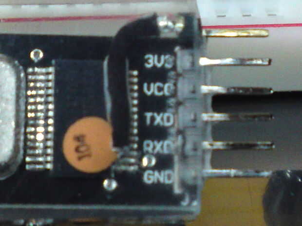 Para el modificado módulo PL2303(foto media) observar las conexiones de Pin y mira el pasador superior (el soldado Extra Pin en oro , sobre el perno de 3V3) - es el Pin de Reset que necesitará ser conectado al Pin de RESET en el Breduino!