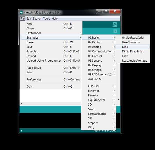 La prueba de dibujo vamos a usar se llama 'Blink' y se encuentra en el IDE de Arduino. Archivo > ejemplos > conceptos básicos > BLINK -este es el bosquejo que utilizaremos para subir a la Breduino!