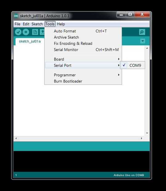 Ahora debe seleccionar el puerto correcto de "COM" para el IDE de Arduino pueda saber exactamente dónde está el PL2303 USB módulo y dónde enviar el bosquejo para después abrir el IDE de Arduino basta con ver la imagen de abajo, mi ordenador no tenía ningún 'COM' puertos en uso hasta que el módulo USB así que lo hice sólo para mostrar que un puerto COM a mostrar-en el IDE de Arduino y debes seleccionarlo y asegúrese de que hay un 'TICK' junto al número de puerto COM como se muestra, el mío es COM9...