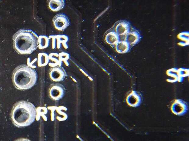 Esto es donde el perno de DTR importante todos se encuentra en el módulo USB y se puede ver desde abajo el módulo que dice las 3 letras 'DTR' que puede ser mejor ve en la imagen de la derecha, abajo (sobre el pin llamado «DSR»)