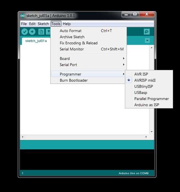 A continuación mira la imagen siguiente y asegúrese de que el 'programador' set AVRISP mkII - de lo que he visto en las semanas cortas de aprendizaje sobre el Software de Arduino IDE es que esta configuración está ya establecido en AVRISP mkII pero solo en caso de que no lo es, no hay daño en la comprobación!