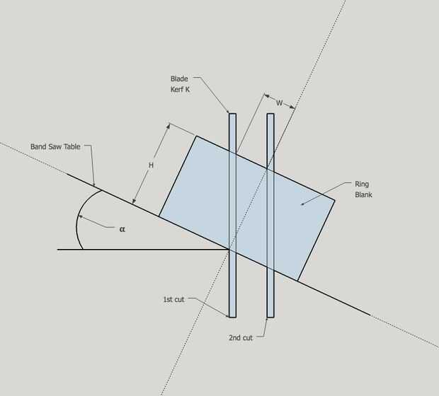Α = ángulo del tazón de fuente, también el ángulo de inclinación de la mesa de Sierra de cinta