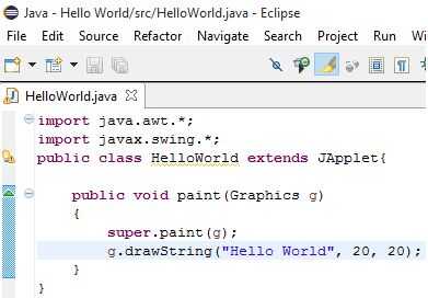 Ahora la izquierda lo único que debe escribir el código para mostrar el applet Hola mundo. Llamaremos a un método llamado lazo que tendrá valores de cadena, x e y como parámetros respectivamente. Para escribir la cadena, estará rodeado por comillas dobles; y x e y valores deben ser un entero. Podemos elegir cualquier x, el valor y como no es 0,0. Si elegimos 0,0; entonces la cadena no será visible, ya que será sobre el área visible.
