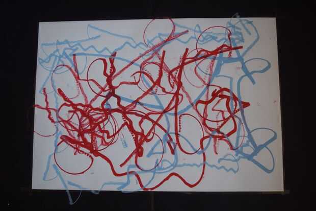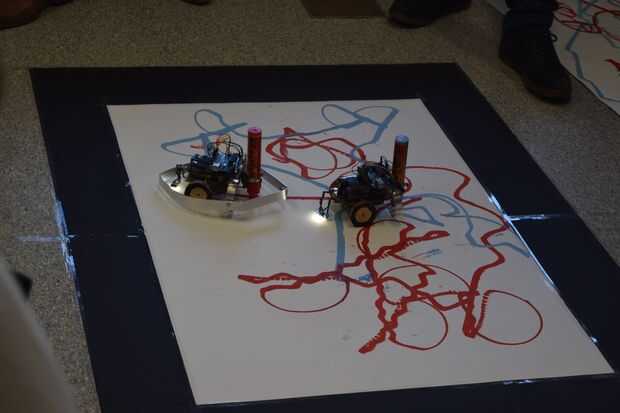 Se construyó dos artbots y uno con un marcador de pintura acrílica azul y el otro había equipado con un marcador rojo.