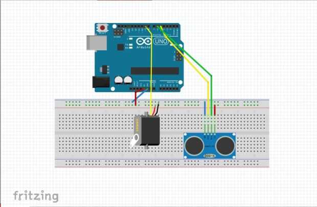 Aquí, que he mostrado una simple representación del sistema de cableado de Groot. Hemos utilizado un servo, un módulo de medición ultrasonido HC-SR04, los cables, la placa y la placa Arduino.
