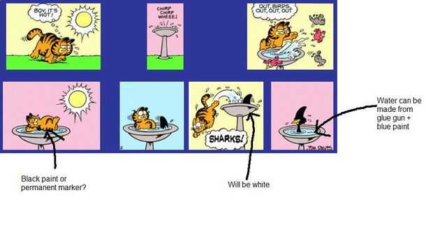 Esto es cuando usted averiguar qué materiales necesita que los que ya mencioné. Este es también donde se puede hacer comentarios sobre lo que usted puede cambiar sobre la franja de según qué materiales no o que no tienen. Por ejemplo, en mi tira cómica ha cambiado los baños de aves por blanco porque será más fácil de pintar, y he observado que puedo usar marcador indeleble o pintura de rayas. Pero más importante aún, señaló que sería una buena idea para una pileta pintura azul dentro y después llenar con pegamento de una pistola de pegamento. Así será necesario azul pintura y una pistola de pegamento (que ya necesito!)