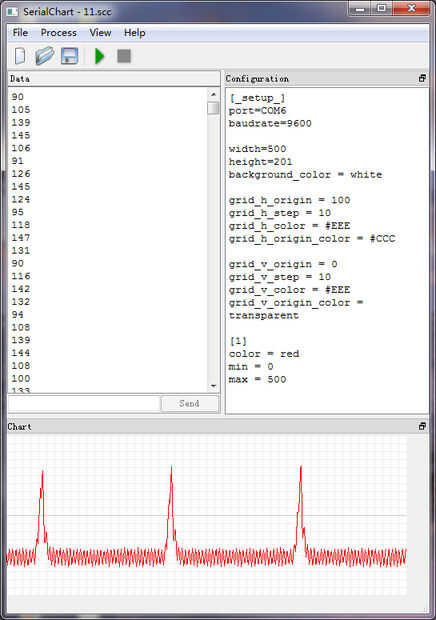 En primer lugar, he subido mi código a la Me-placa base y he utilizado el software "Serie cartas" para leer el valor del sensor de luz. Puesto que hay un montón de ruido y los datos en bruto no están muy estables, usé Laplace de matriz gaussiana [-1, 4, -1] para hacer la segunda derivada de los datos de luz. Como se puede ver en la segunda foto la espiga es mucho mejor que los datos brutos de la luz. Es muy fuerte y gran valor. El valor de la luz en papel es fácil distinguir el valor de la luz en el neumático. Entonces, utilicé un filtro para eliminar el valor inestable por debajo de cierta referencia. Estos algoritmos se muestran en mi código.