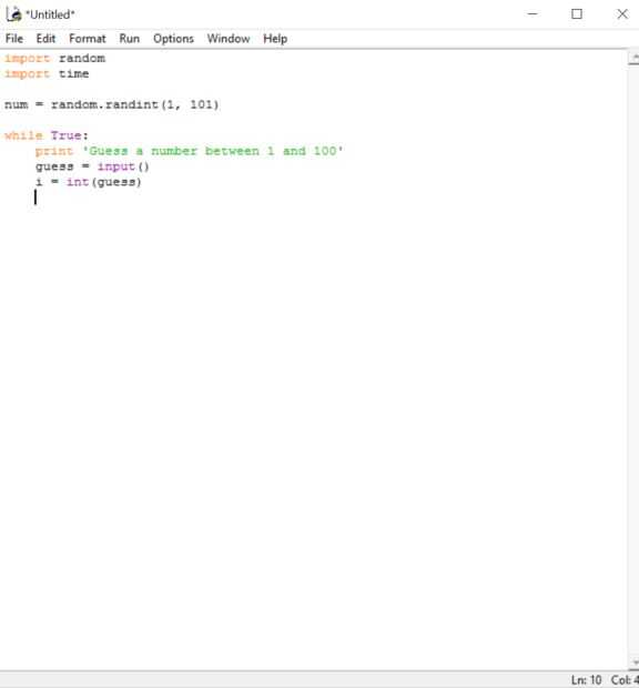 Ahora tienes que tener lo siguiente si bien es cierto sangrado. También necesitará dos puntos también. Lo que dice este pedazo de código es impresión adivinar un número entre 1 y 100. Eso es lo que verá el usuario cuando ejecuta este programa.