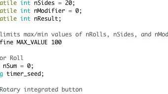 Después de mi texto y números de roll y resultados donde quería, lo hice para que el usuario podría ser en los modos de selección diferente para cambiar el número de dados a rodar y el número de lados. Usé una semilla aleatoria del número de milisegundos desde el dispositivo fue en y genera un número aleatorio cada vez que pulsan el botón de rodillo. También tenía la pantalla actualizar sólo cuando un número fue cambiado, para reducir la sobrecarga de CPU innecesariamente.