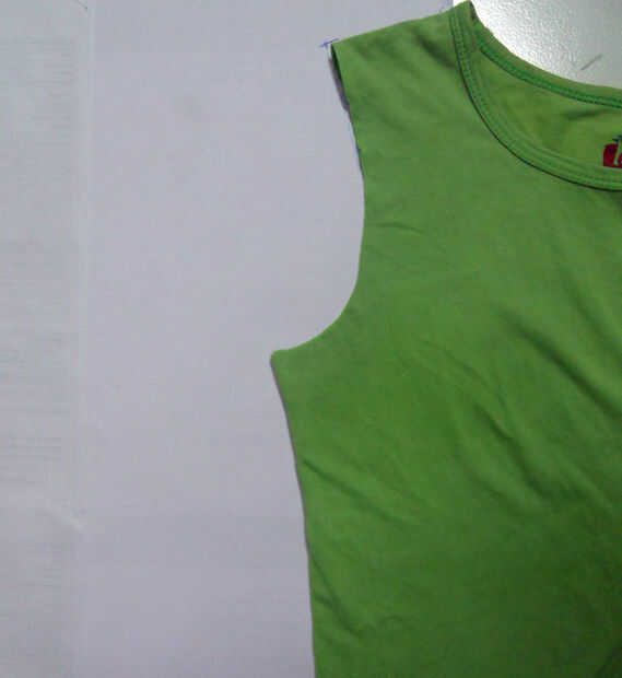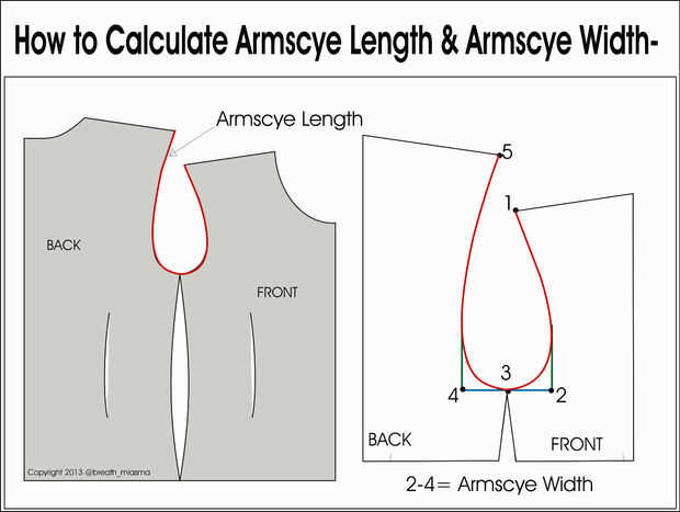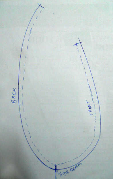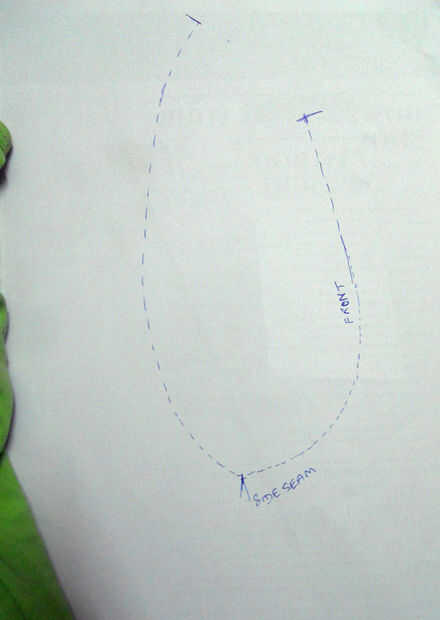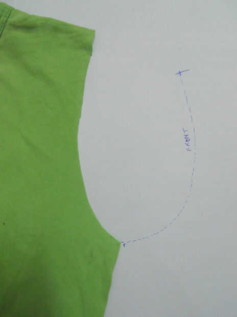 1. Coloque la prenda en un trozo de papel. Trazar la parte delantera y trasera agujero del brazo de la prenda en cuestión. Pasar 1/4 pulgadas y re dibujar el agujero del brazo sin su margen sobre el papel y marca la costura lateral. Nota en la figura anterior la línea roja muestra el largo de sisa.