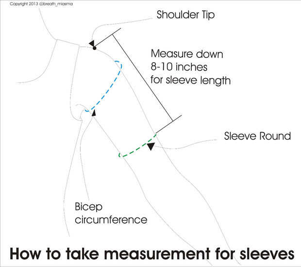 6. manga redondo medida = ___ pulgadas + 2 a 3 pulgadas facilidad. (De la medida del hombro hacia abajo por 8 a 10 pulgadas. En esta posición Mida la circunferencia del brazo.)