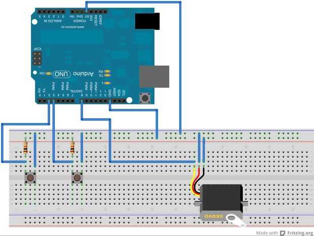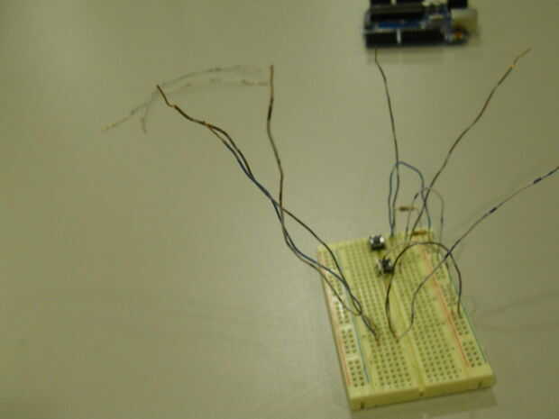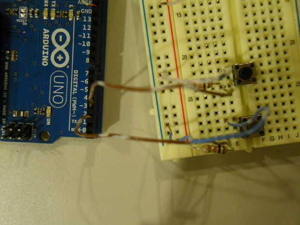 En la columna con el botón y el resistor, coloque otro cable puente y conectar al pin 2 o 3 en el arduino. Pin 2 es para el interruptor de la izquierda y el pin 3 es para el interruptor de la derecha.