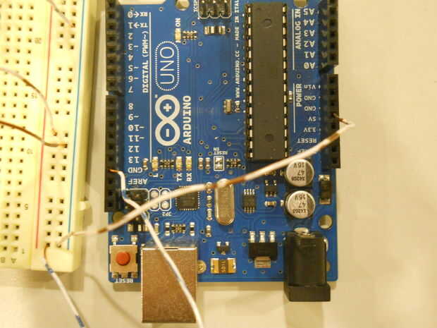 Conectar el interior carril de la placa con el conector de tierra y el carril exterior de la placa a los 5V pin en el arduino.