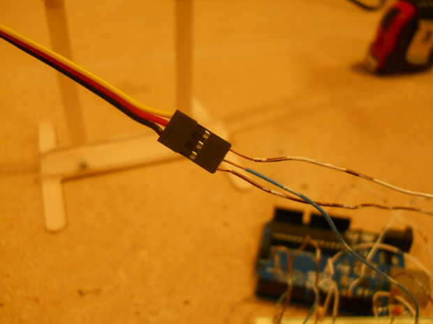 Conecte el cable negro del servo al interior riel usando los cables de puente, el cable rojo en el riel exterior utilizando un puente de alambre y el cable amarillo del servo al pin 8 del arduino.