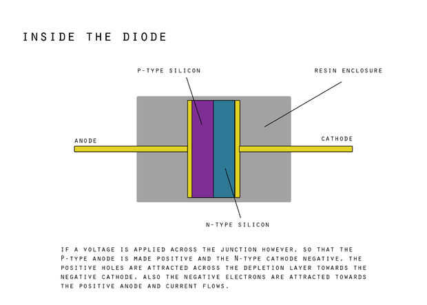 Los diodos están hechos de dos capas diferentemente dopadas del material semiconductor que forman una Unión PN. El material tipo P tiene un exceso de portadores de carga positiva (huecos) y el tipo N, un exceso de electrones. Entre estas capas, donde se encuentran los materiales tipo P y tipo N, combinan agujeros y electrones, con electrones de desbordamientos con exceso agujeros para cancelar uno otro hacia fuera, así que una capa delgada se crea que tiene ninguno de los dos portadores de carga positiva ni negativa presente. Esto se llama la capa de agotamiento.