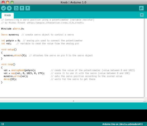 Este programa impulsa un motor servo, por la conexión del motor al pin PWM 9 de Arduino y el potenciómetro analógico 0. El potenciómetro determinará la posición del servo enviando corriente una resistencia variable al puerto A0 en el Arduino, que el código de Arduino interpreta entonces a una señal de pulsos para el servo. Después de carga el sketch a la placa Arduino, el motor girará en base en la posición que el potenciómetro se gira a.