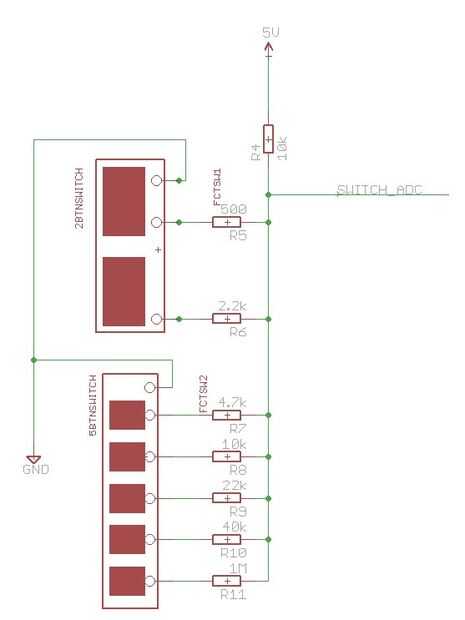 No dude en sustituir en sus propios valores para R2 si sólo tiene ciertas resistencias prácticos... Lo clave aquí es mantener una brecha bastante amplia en la tensión entre los contactos de modo que cualquier margen de error en el ADC no pondrá en la tensión de la espera de un switch vecino. He encontrado lo más fácil es construir la escalera de divisor y poner un Multímetro/voltímetro en el pin de ADC y presione cada pin y ver qué valores tienes. Deben ser bastante terreno en lo que se calcula.
